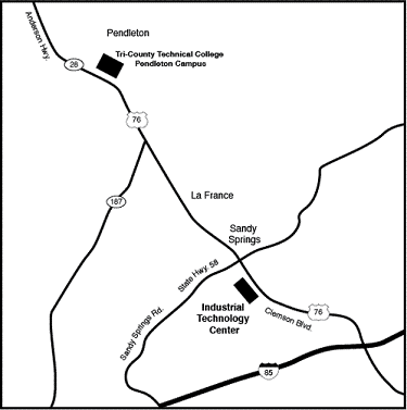 Tri-County Technical College has four campuses: the Pendleton Campus, located at 7900 Highway 76 in Pendleton, SC; the Anderson Campus, located at 511 Michelin Boulevard in Anderson, SC; the Easley Campus, located at 1774 Powdersville Road in Easley, SC; and the Oconee Campus at 552 Education Way, Westminster, SC.
